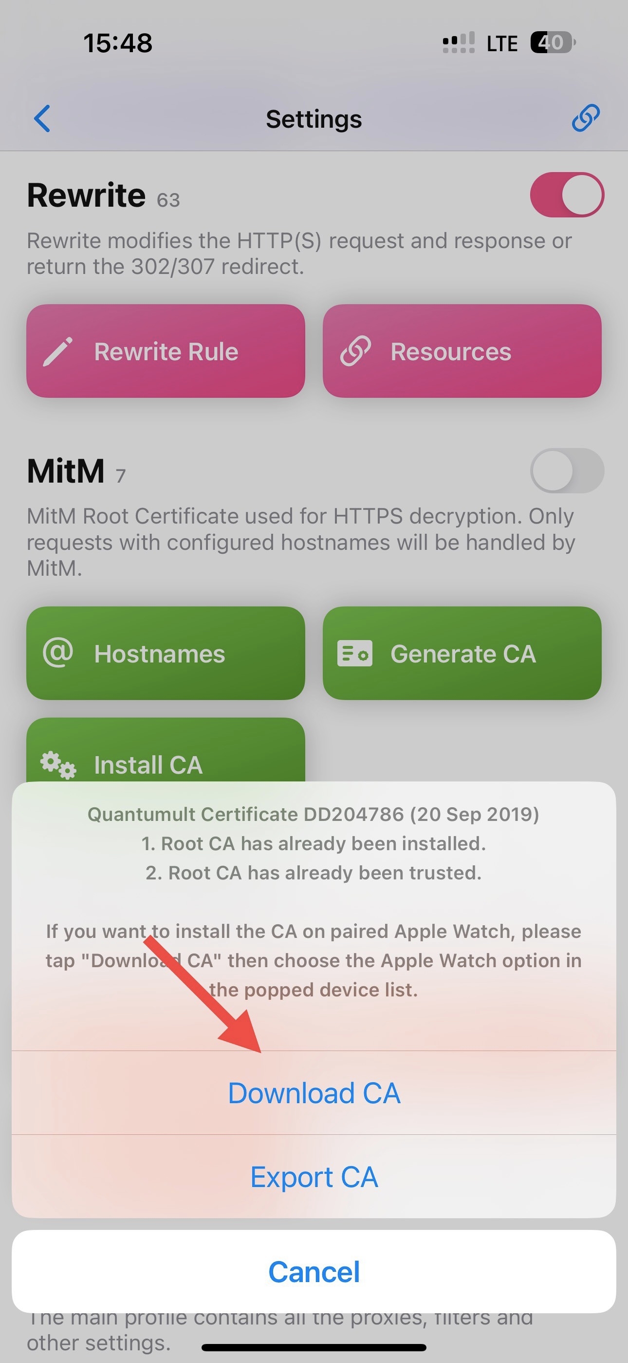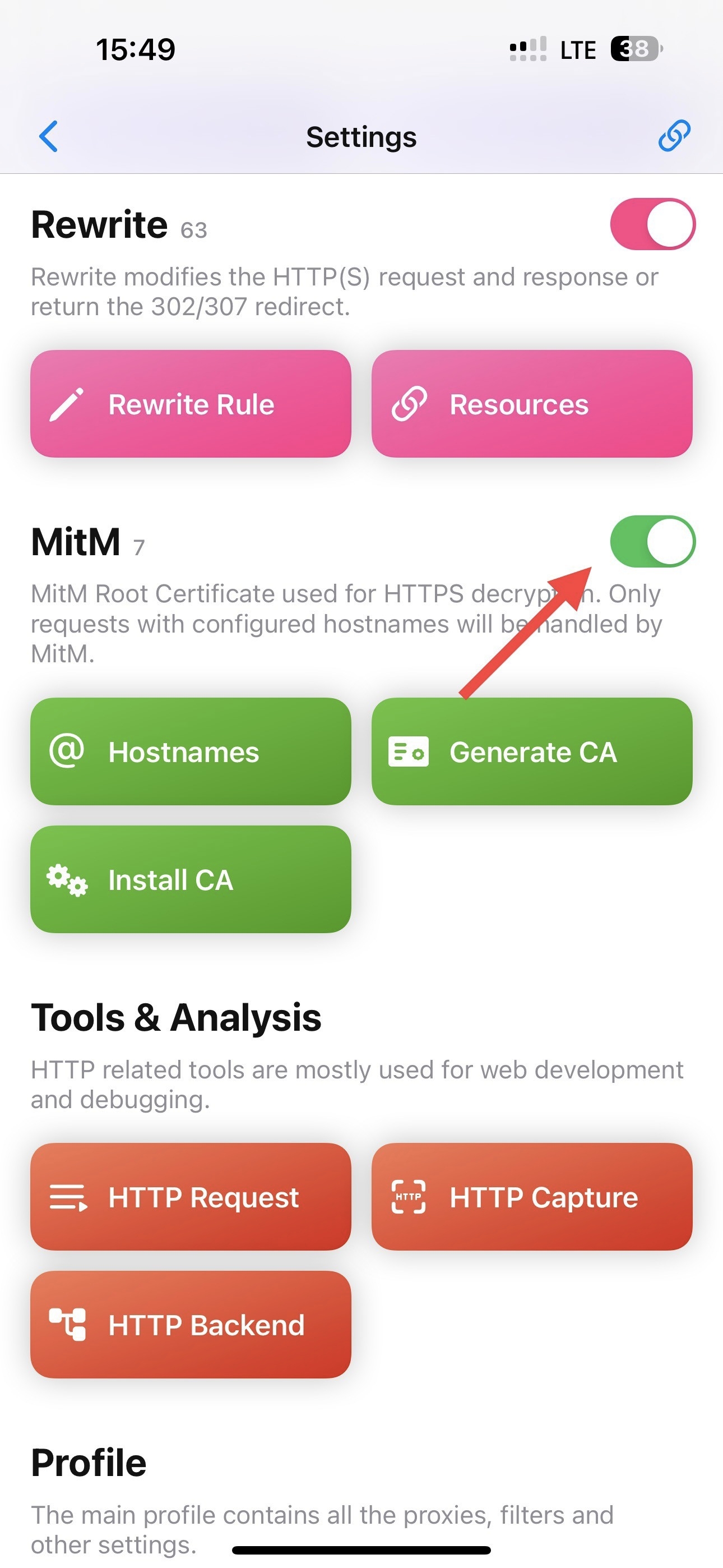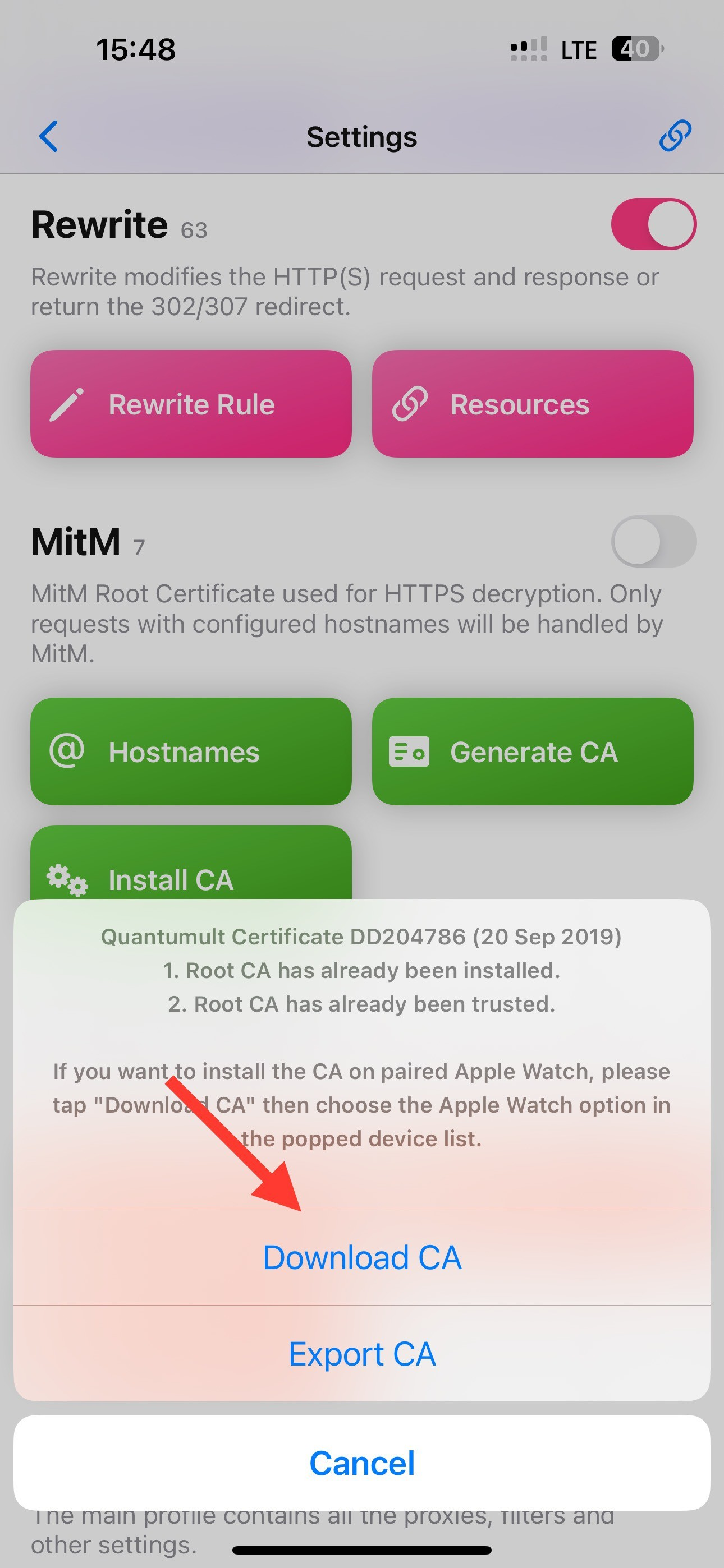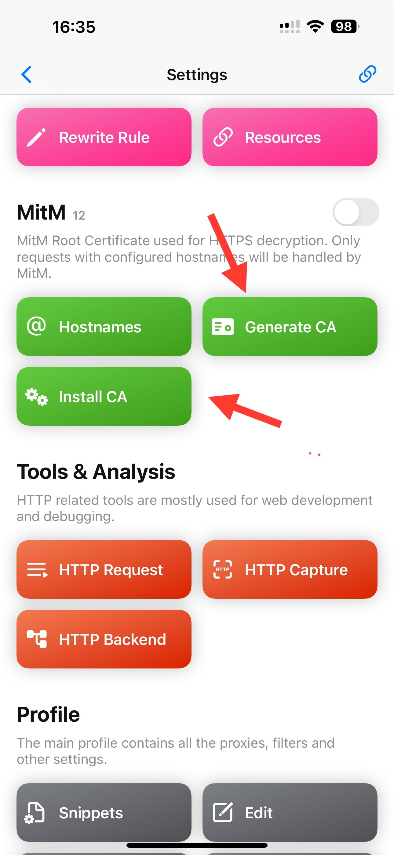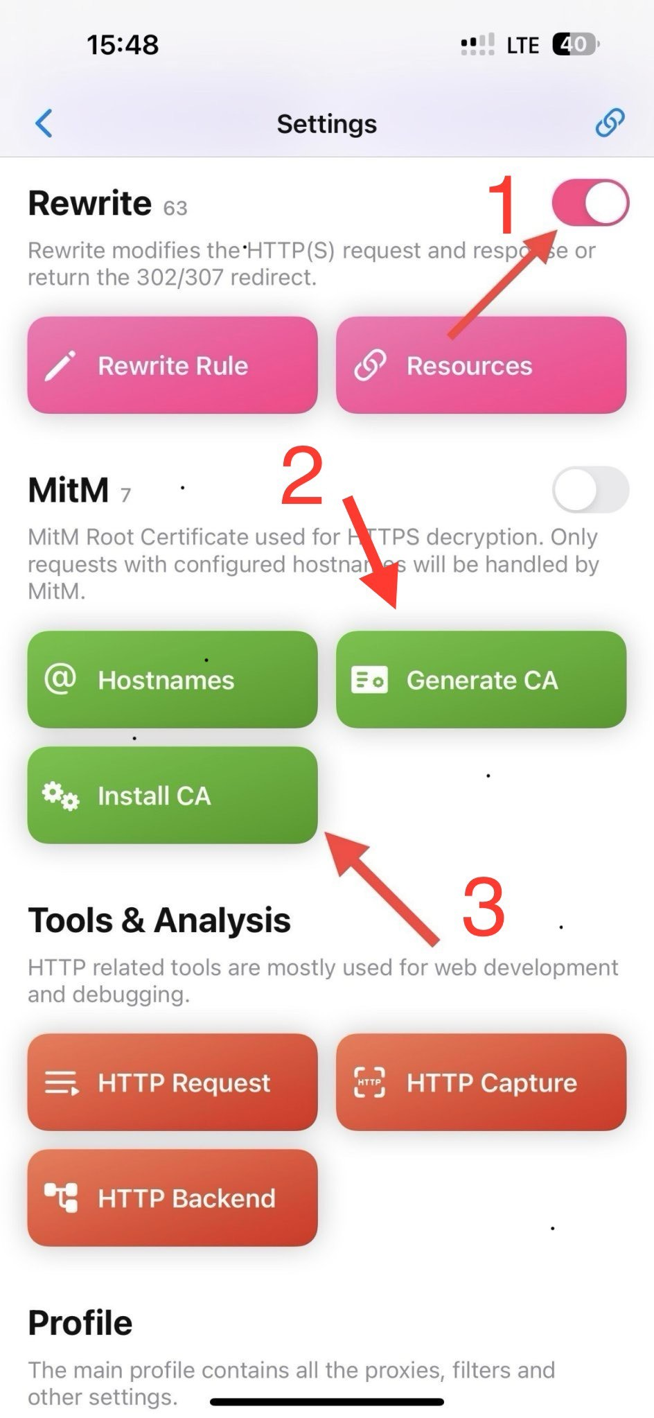 Bật Rewrite lên, chọn Generate CA và chọn Install CA tại mục MitM