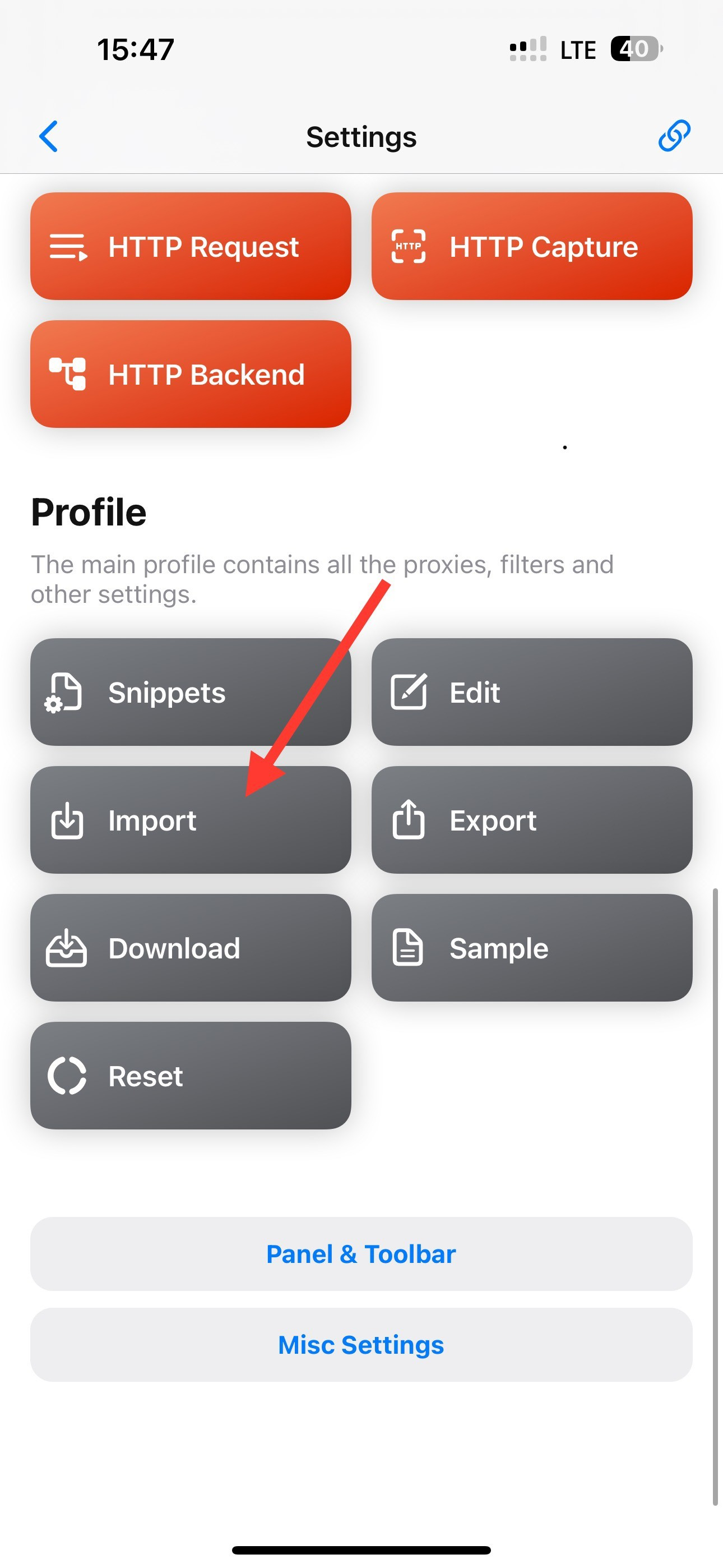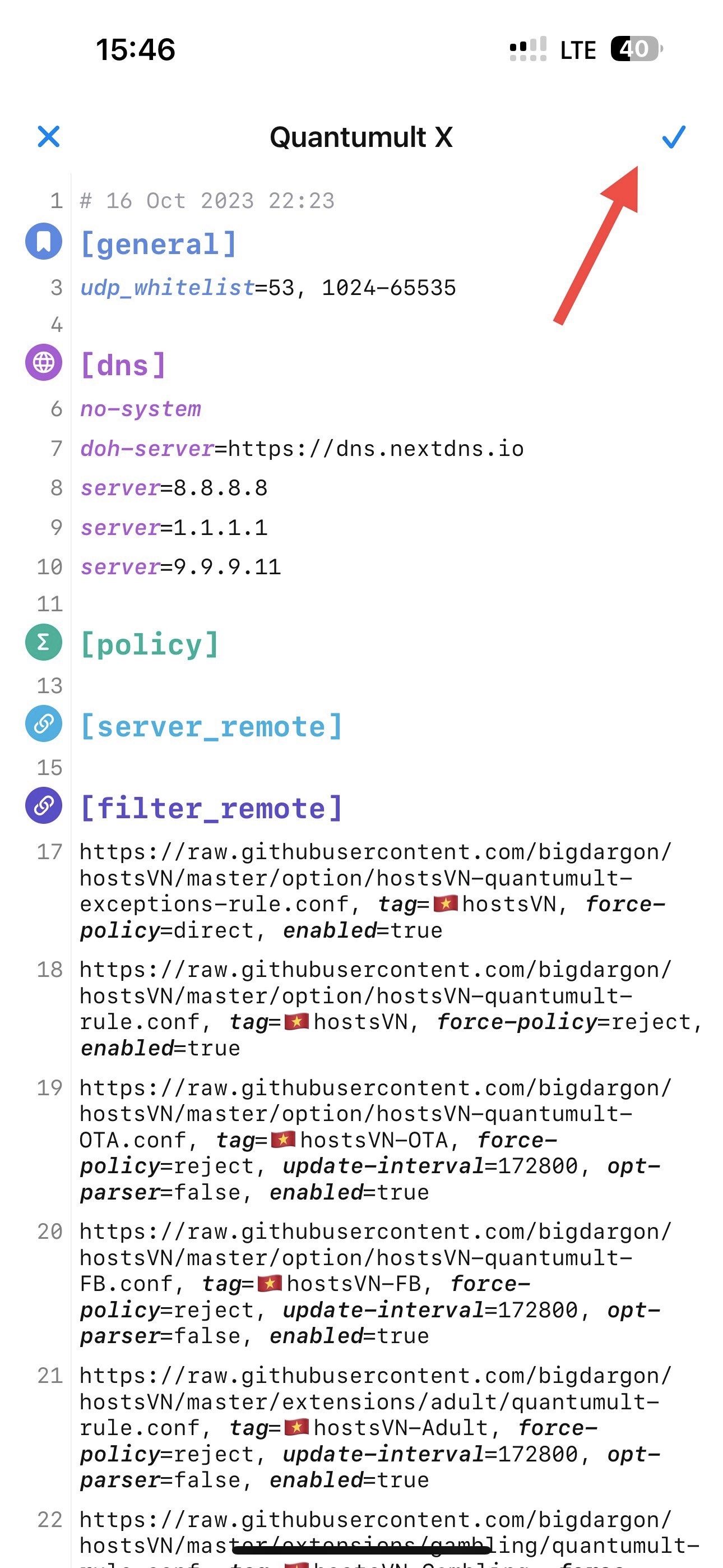 Vào lại app Quantumult X kéo xuống dưới cùng chọn chữ Import