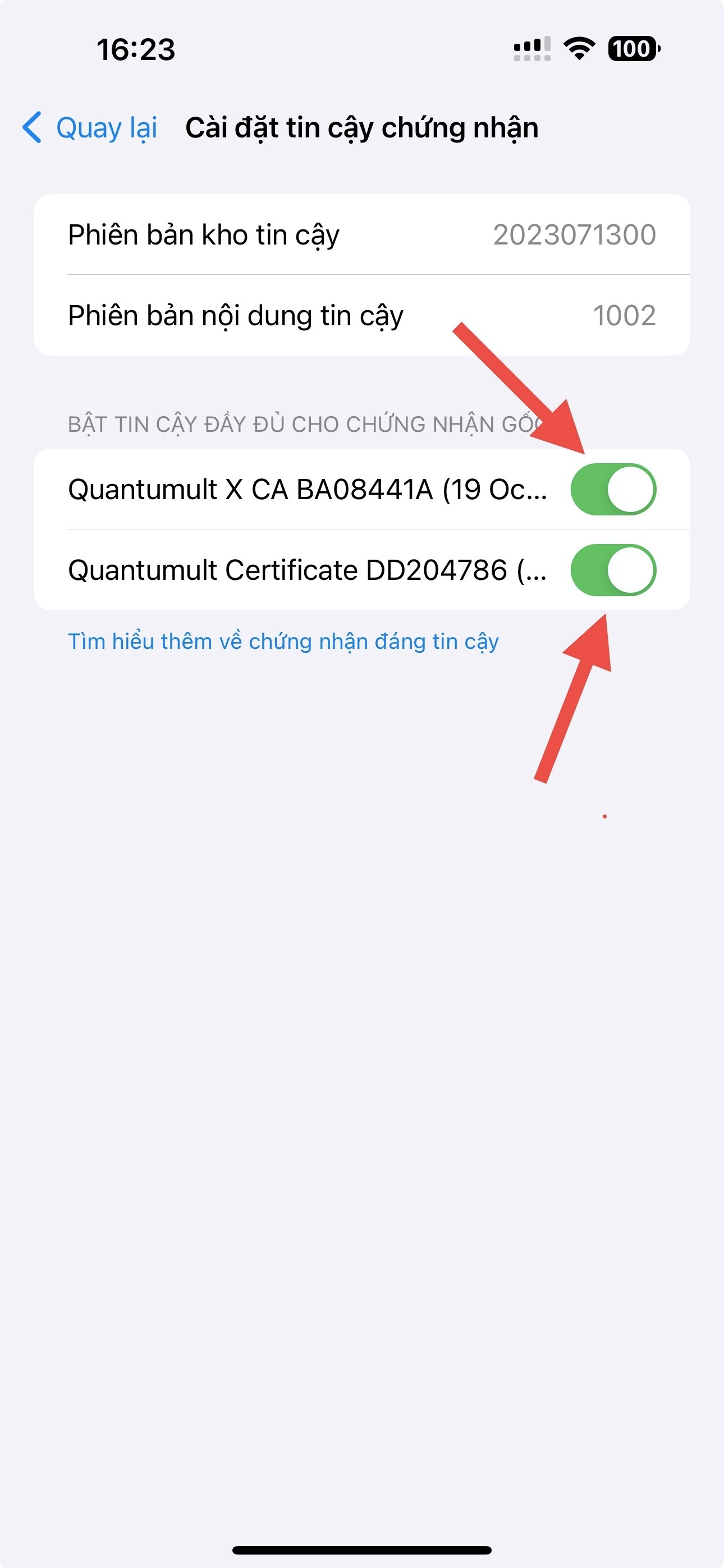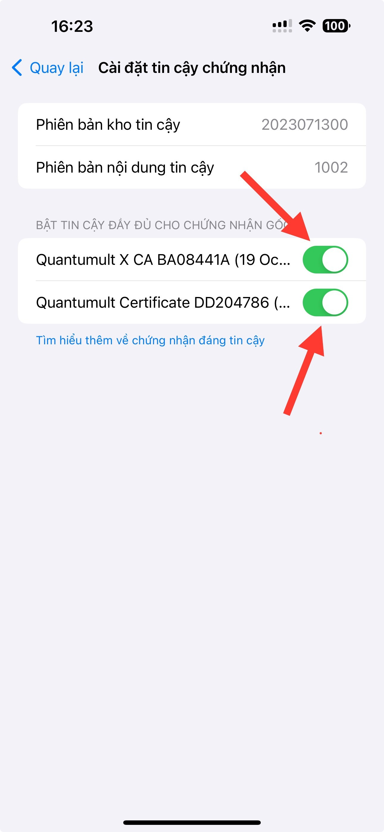 Mở thiết bị điện thoại của bạn lên vào cài đặt chung - Giới thiệu - Cài đặt tin cậy chứng nhận bật 2 thanh gạt ( Quantumult X CA và Quantumult Certificate )